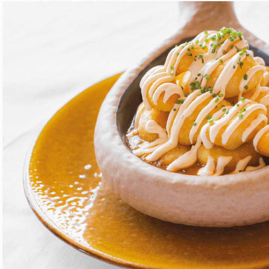 Con salsa brava casera y muselina de ajo. Alergias: huevo, lactosa y sulfitos