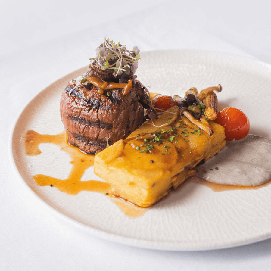 Salsa monastrell, Crema de boletus. Milhoja de patata y verduritas. Extra foie 5€